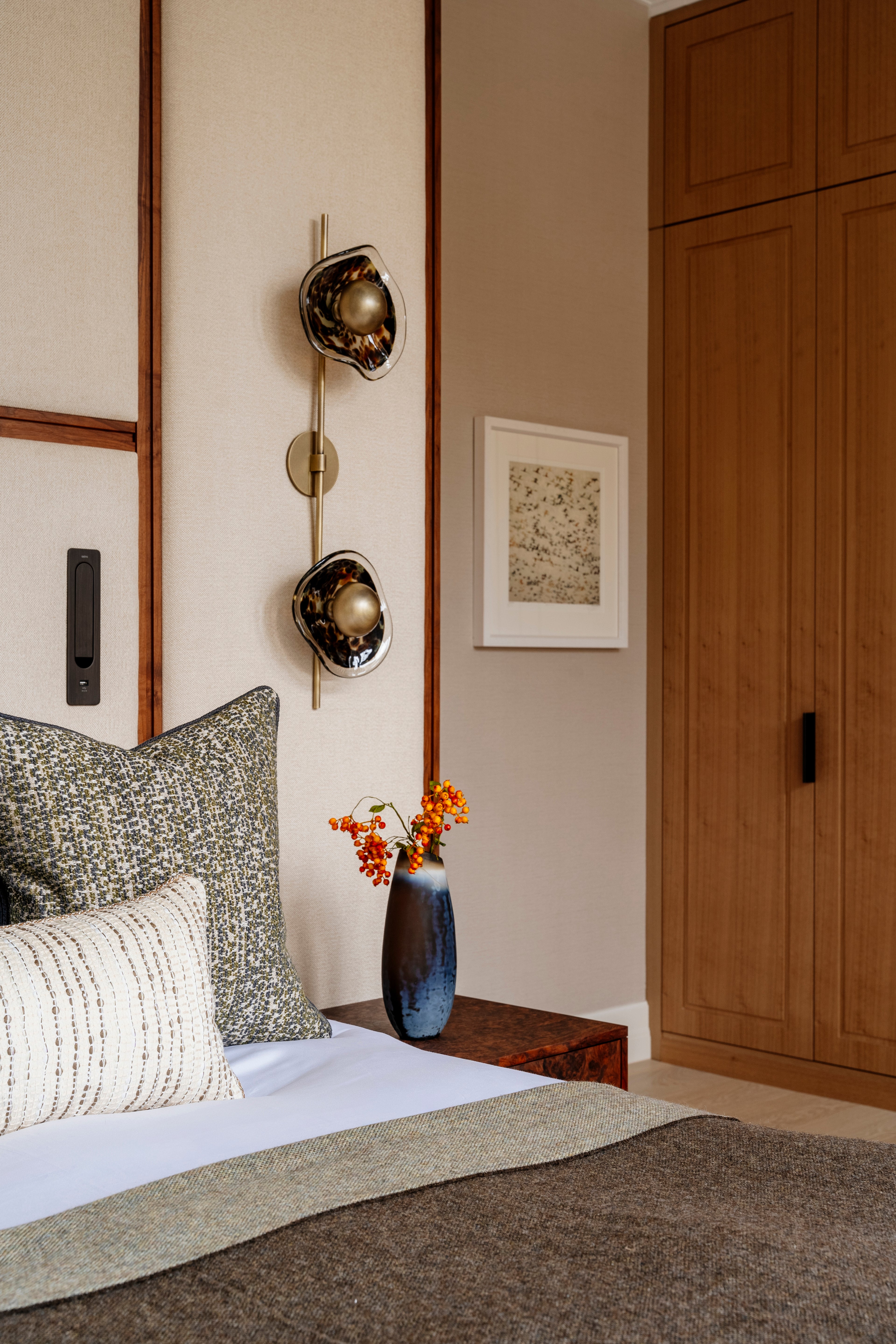 Designed by interior designer Studio Miaki, this stunning London townhouse went through a complete refurb. Studio Miaki selected the Ortus Wall lights for the master bedroom along with a bespoke design chandelier for the staircase.